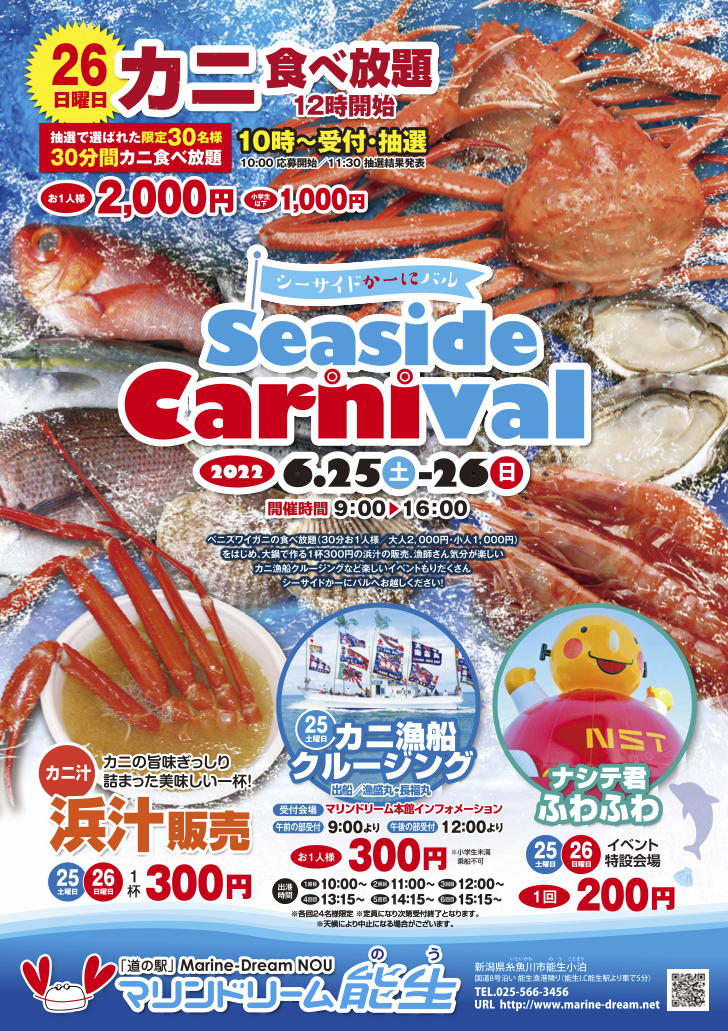 毎年恒例になっております道の駅マリンドリーム能生にて開催されるシーサイドかーにバル カニ食べ放題企画をはじめ、カニ汁販売、カニ漁船クルージング等が行われます。 カニ食べ放題26日 10:00〜受付・抽選 12:00開始(12:30終了) 浜汁販売(カニ汁)25日、26日 9:00 […]